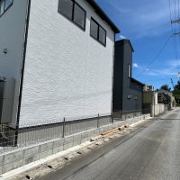 擁壁工事無事終了。 新築住宅完了後、tブロック擁壁上に落下防止フェンス設置で完了。 無事故無災害で擁壁工事は無事完了。皆んなお疲れ様でた。